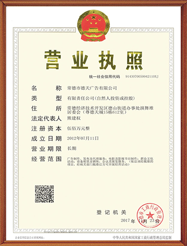 “常德德山山有德”,山有德,源于人有德。湖南德天人禾文化旅游有限公司創(chuàng)始人熊建權先生深受“善德”文化影響,于2018年10月成立該公司,并將公司設于湖南德山之巔,常德沅水之畔,中國善德文化發(fā)源之地——德山(國家級常德經(jīng)濟技術開發(fā)區(qū)),自有辦公樓580平方。旗下全資子公司——常德市德天廣告有限公司成立于2012年7月,擁有設備倉儲生產(chǎn)車間1000多平方。
